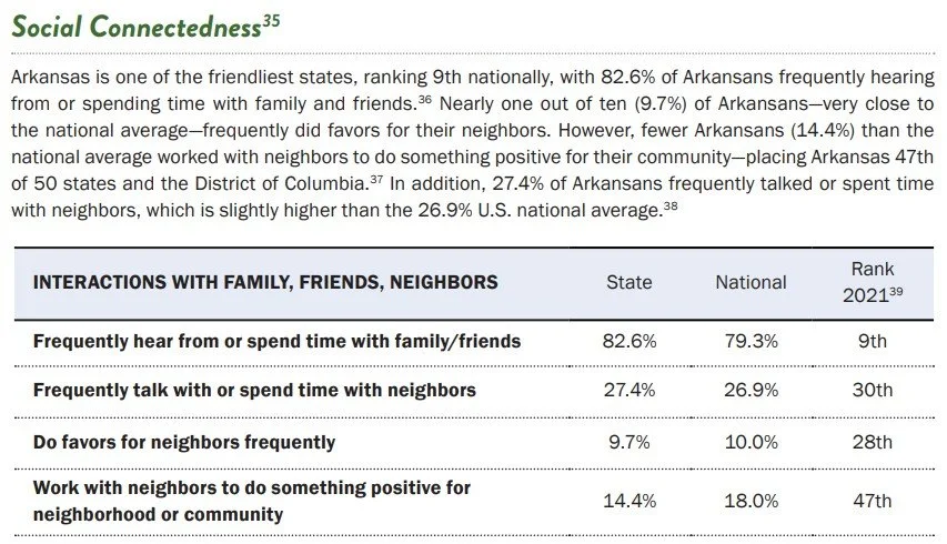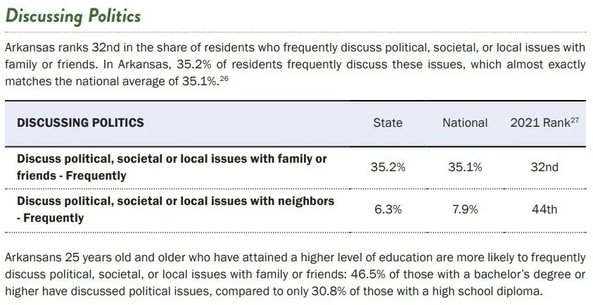 Below is data from the 2023 Arkansas Civic Health Index, which was completed in partnership with the Clinton School of Public Service at the University of Arkansas and released in December 2023 by the National Conference on Citizenship.